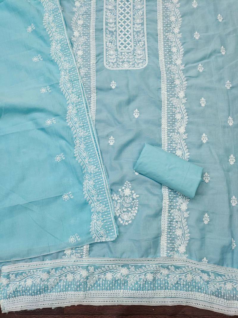 | Product Name | Sky Blue Embroidered Cotton Semi Stitched Churidar Dress Materials | |