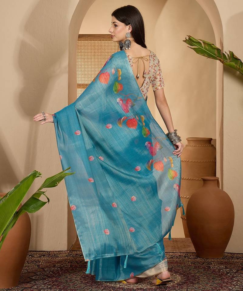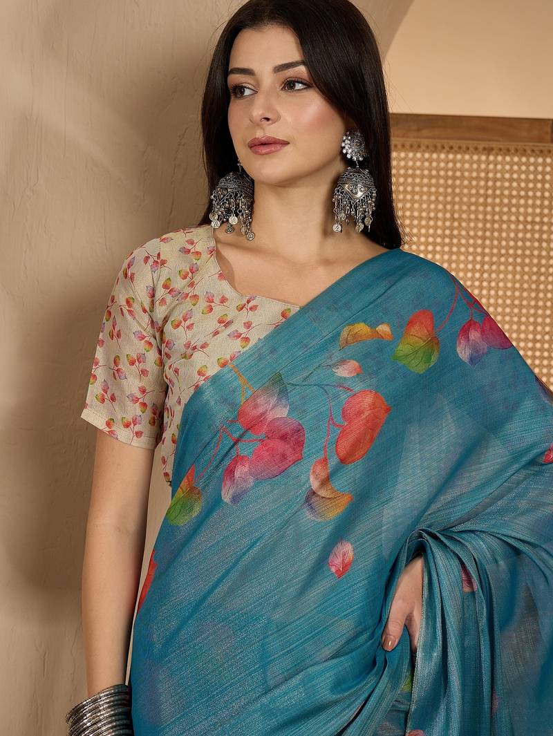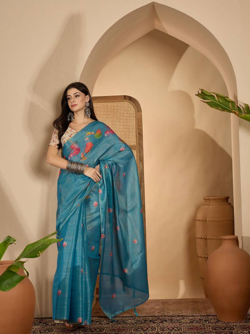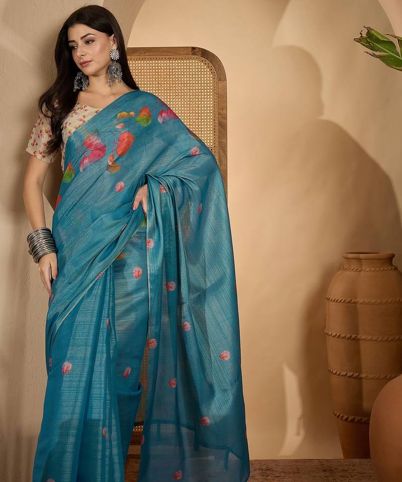 Product Description | Embrace Timeless Elegance With This Teal Blue Eroad Silk Saree Featuring Exquisite Digital Floral Print Work. Crafted From Lightweight, Soft Textured Silk, This Saree Offers A Graceful Drape And All Day Comfort. The Subtle Sheen Of Eroad Silk Combined With Delicate Multicolor Digital Floral Motifs Lends A Sophisticated Ethnic Charm, Perfect For Modern Women Who Appreciate Tradition With A Contemporary Twist. Designed For Festive Celebrations, Traditional Gatherings, And Elegant Office Looks, This Saree Pairs Beautifully With Statement Silver Jewelry Or Classic Gold Accents. Its Minimal Yet Artistic Floral Pattern Makes It Ideal For Day Functions, Casual Parties, And Semi Formal Occasions. Drape It Effortlessly To Showcase An Ethnic Yet Trendy Style. |