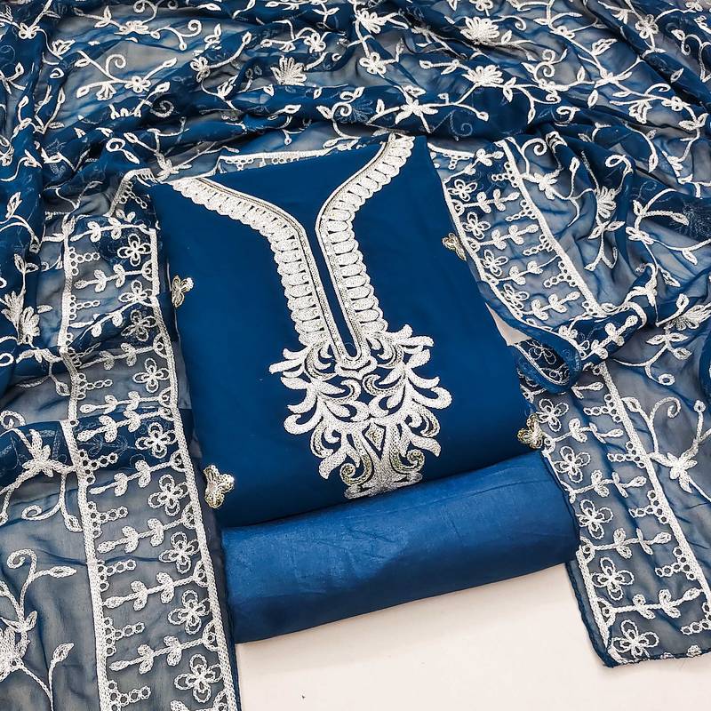 | Product Description | Dashing Heavy Chain Thread Sequin Embroidery And Fancy Border With Embroidered Dupatta Straight Style 2.10 Mtr Unstitched Dress Material Top Of Teal Blue Colour Georgette Fabric With 2 Mtr Santoon As Lining Inner Fabric Also Including 3.60 Mtr Unstitched Bottom Material Of Teal Blue Colour Santoon Fabric With 2.10 Mtr Dupatta Of Teal Blue Colour Georgette Fabric |