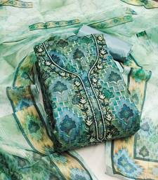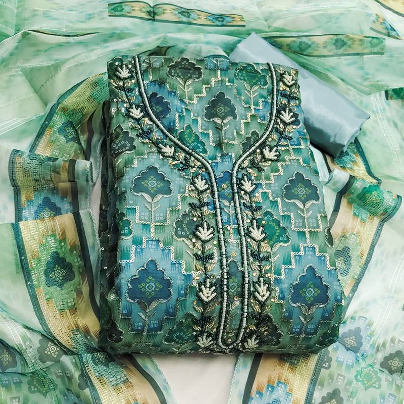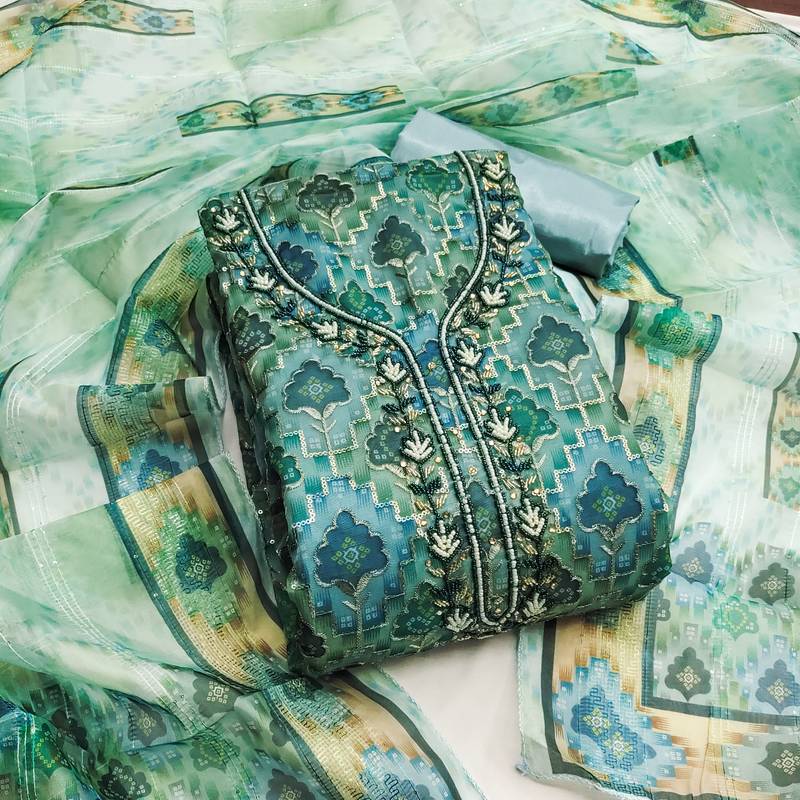 Teal color sequence heavy organza straight churidar dress material semi stitched
