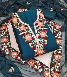 Teal color thread work heavy roman silk straight churidar dress material semi stitched