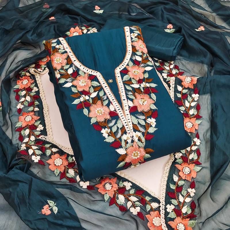 | Product Description | Dashing Heavy Thread Embroidery And Hand Work With Deisngner Thread Work Dupatta Straight Style 2.20 Mtr Unstitched Dress Material Top Of Teal Colour Heavy Roman Silk Fabric Also Including 2.40 Mtr Chudidar Style Bottom Piece Material Of Teal Colour Heavy Santoon Fabric With 2.20 Mtr Dupatta Of Teal Colour Heavy Organza Fabric By Shadow & Saining Brand |
