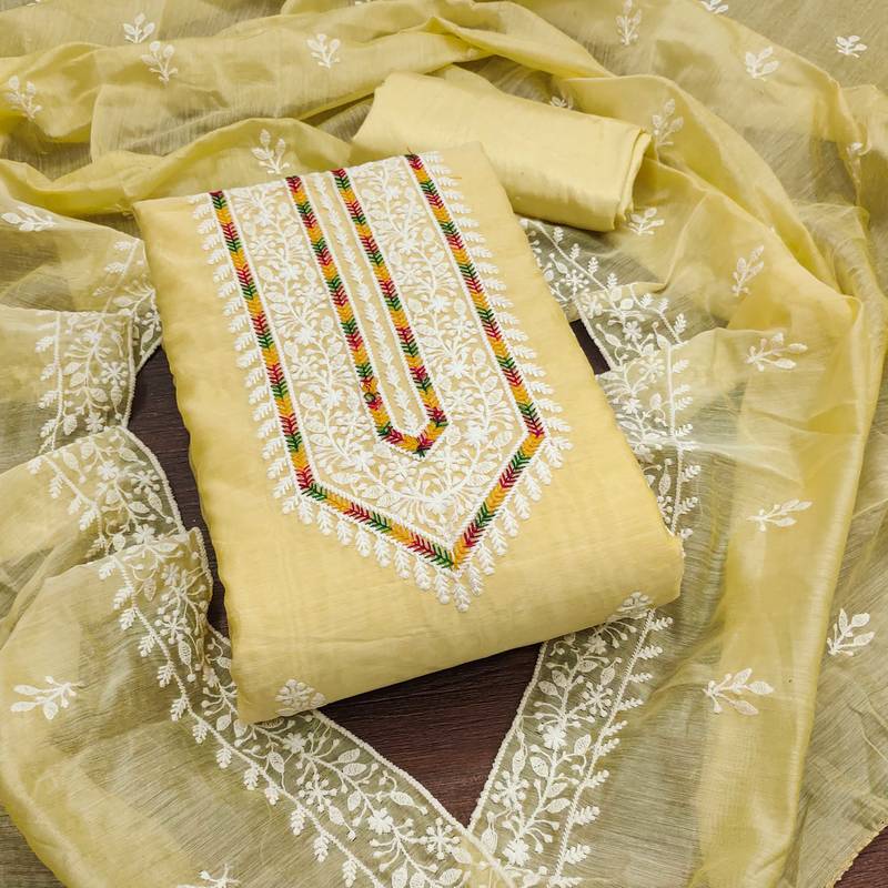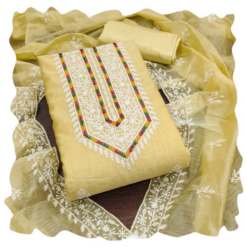 | Product Description | Skin Friendly Heavy Thread Multi Embroidery And Fancy Border With Embroidered Dupatta Straight Style 1.90 Mtr Unstitched Dress Material Top Of Yellow Colour Modal Cotton Fabric With 2 Mtr Santoon As Lining Inner Fabric Also Including 3.60 Mtr Unstiched Bottom Material Of Yellow Colour Santoon Fabric With 2.00 Mtr Dupatta Of Yellow Colour Modal Cotton Fabric By Shadow & Saining Brand |