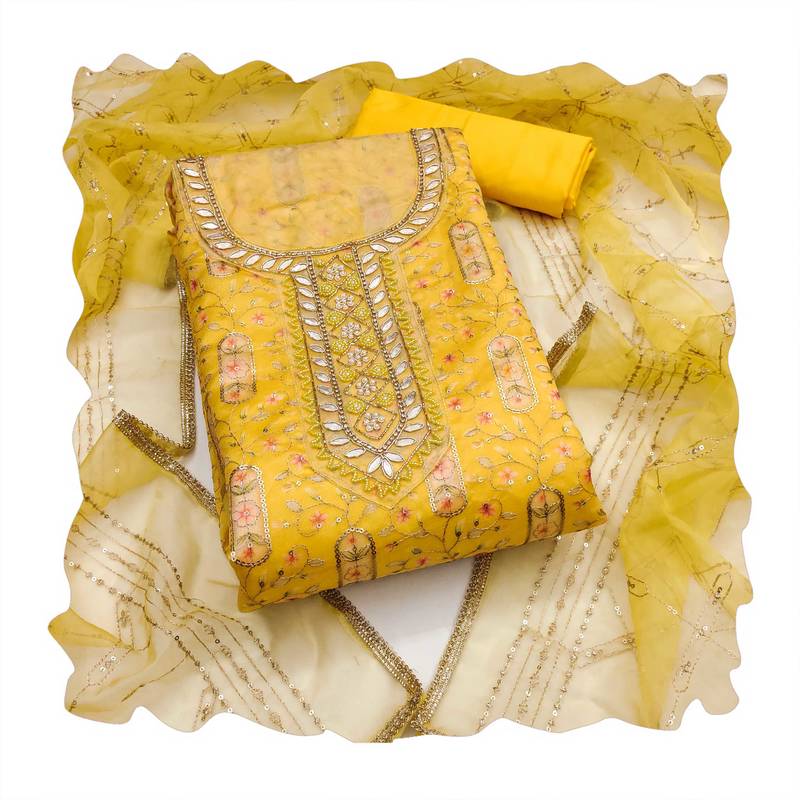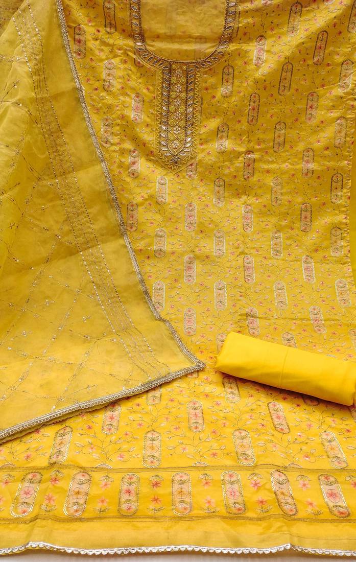 | Product Description | Premium Heavy Thread Sequence Work, Handwork And Fancy Border With Embroidered Dupatta Straight Style 2.00 M Unstitched Dress Material Top Of Yellow Colour Viscose Organja Fabric With 2 Mtr Dull Santoon As Lining Inner Fabric Also Including 3.80 Mtr Unstiched Bottom Material Of Yellow Colour Dull Santoon Fabric With 2.10 Mtr Dupatta Of Yellow Colour Organja Fabric By Shadow & Saining Brand |
