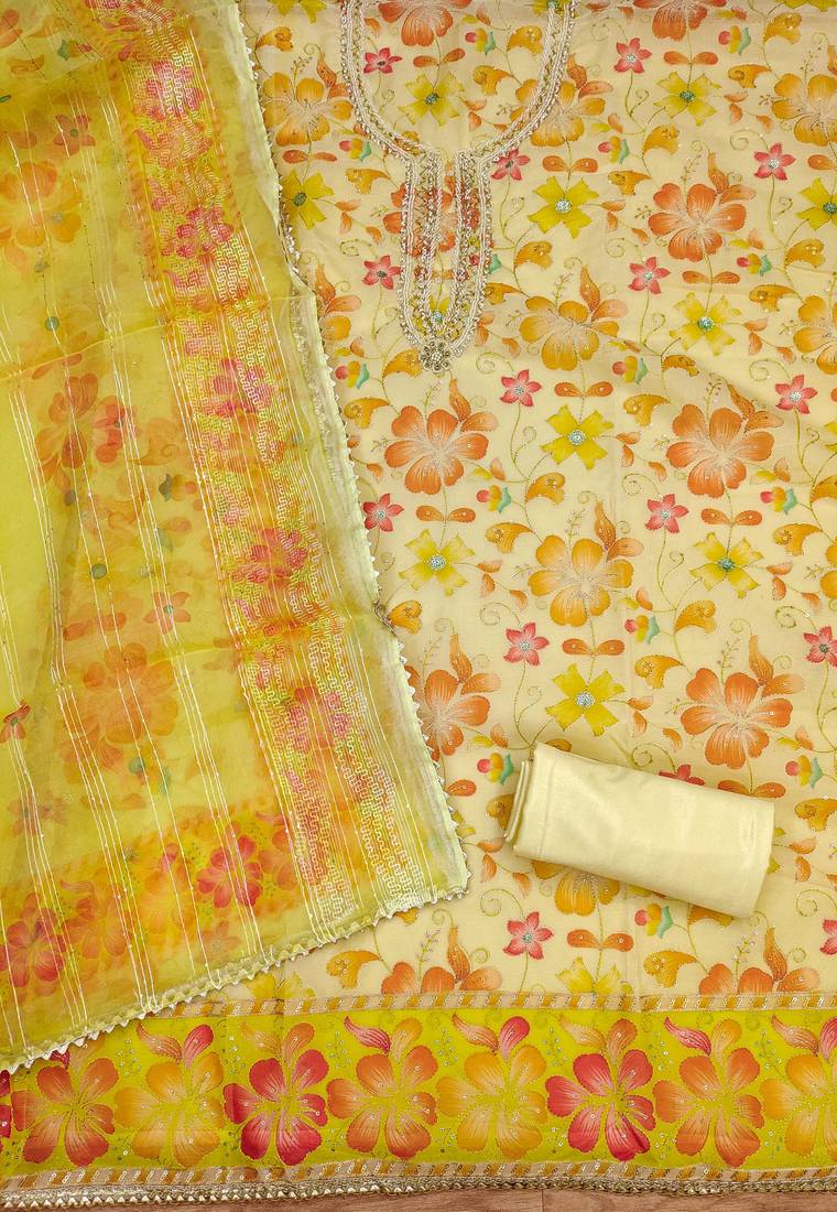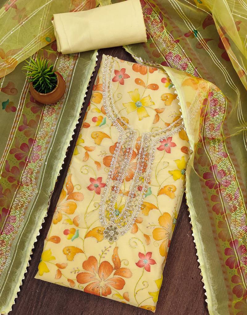 | Product Description | Heavy Position Print Thread Sequnce Work Handwork And Fancy Border With Embroidered Dupatta Straight Style 2.00 Mtr Unstitched Dress Material Top Of Yellow Colour Organza Fabric With 2 Mtr Santoon As Lining Inner Fabric Also Including 3.80 Mtr Unstitched Bottom Material Of Yellow Colour Santoon Fabric With 2.10 Mtr Dupatta Of Yellow Colour Organza Fabric |