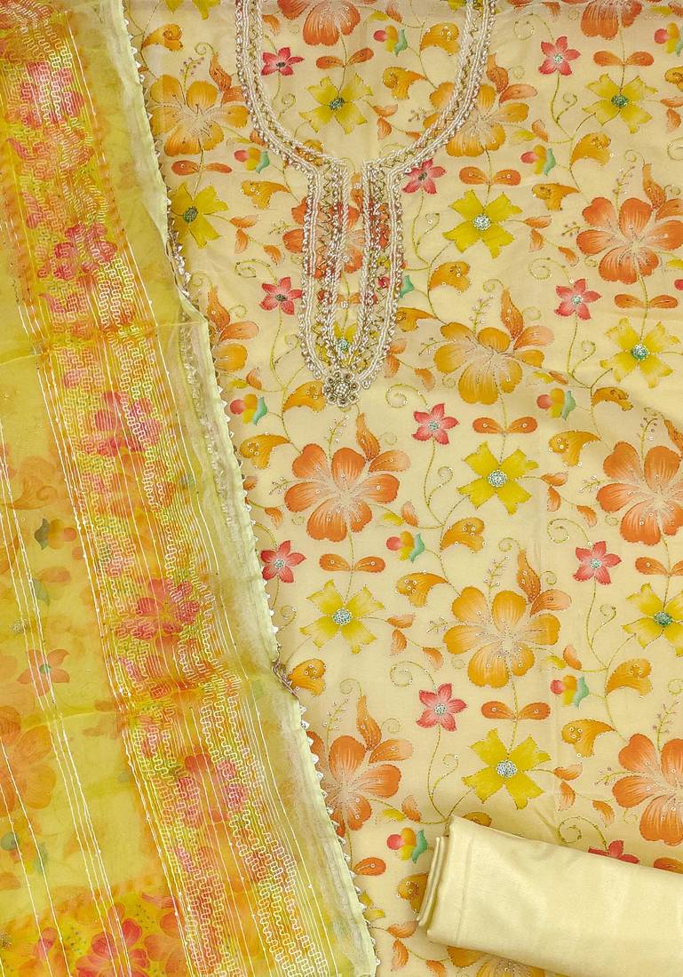 Yellow organza sequins dress material unstitched