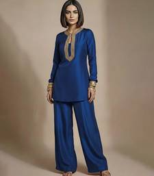 | Product Description | An Elegant Blue Raw Silk Co Ord Set Adorned With Refined Embroidery For A Regal Finish. The Luxurious Texture And Structured Drape Create A Polished Look, While The Contemporary Co Ord Styling Keeps It Versatile. Ideal For Festive Evenings, Family Celebrations, And Semi Formal Ethnic Wear.