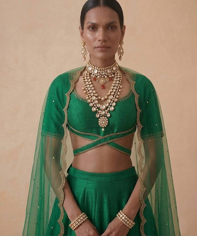 | Product Description | This Emerald Green Raw Silk Lehenga Set Showcases Intricate Embroidery That Enhances Its Regal Charm. The Rich Texture And Structured Silhouette Create A Graceful Fall. Ideal For Weddings And Festive Occasions, It Pairs Beautifully With Traditional Jewelry For A Timeless And Elegant Appearance.