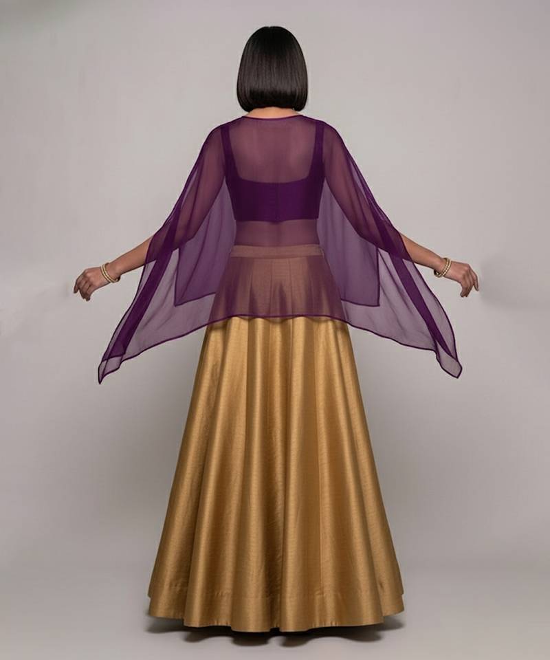 | Product Name | Gold Raw Silk Indo Western Lehenga Set With Purple Blouse | |