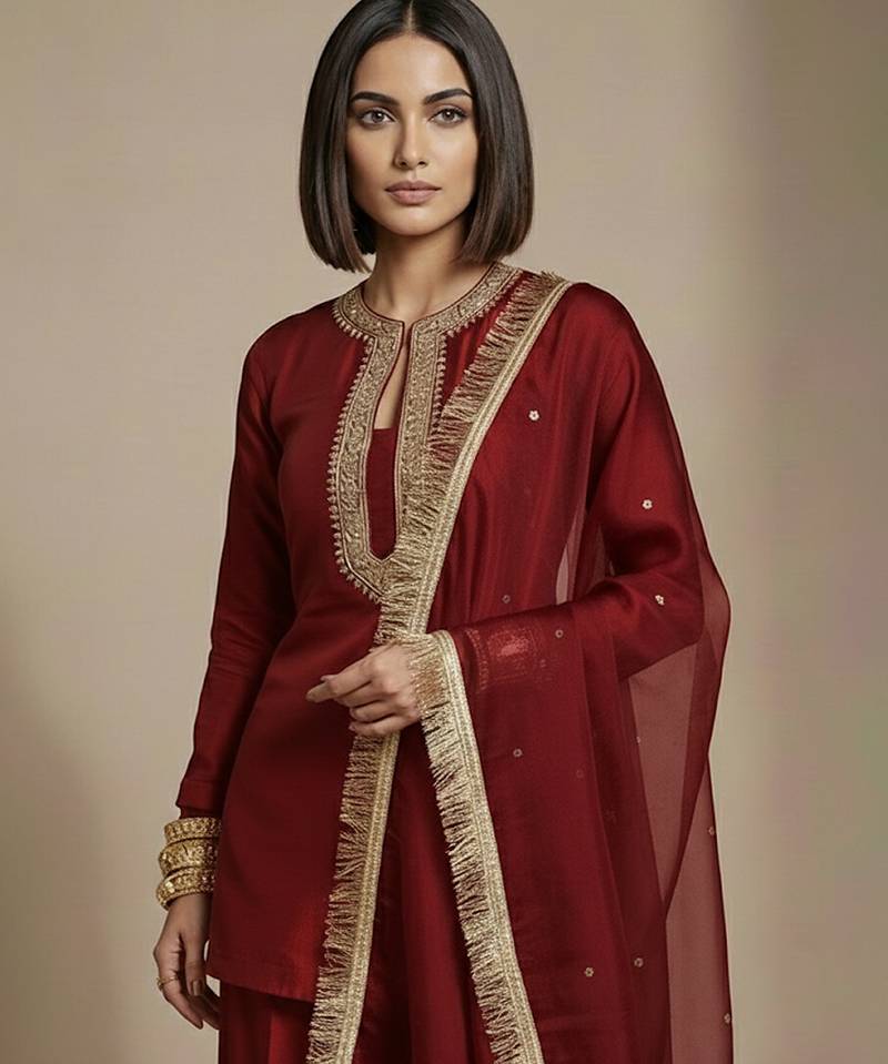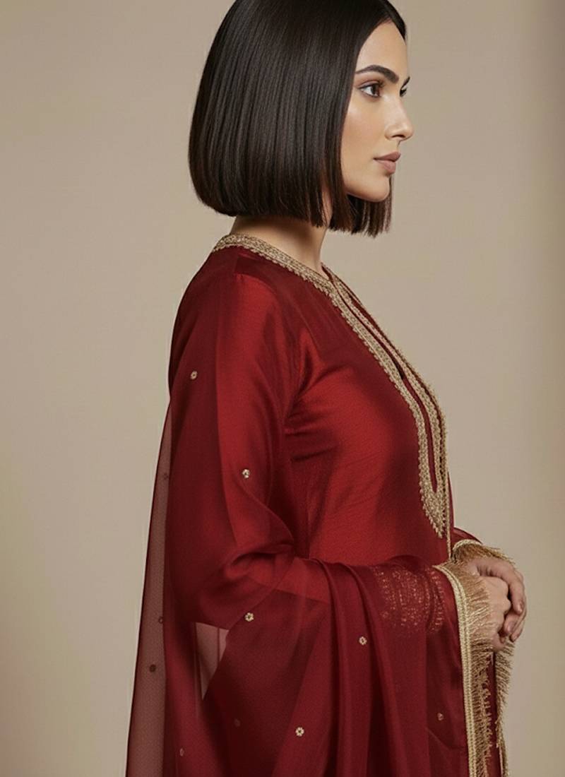 | Product Description | A Rich Maroon Raw Silk Co Ord Set Enhanced With Ornate Embroidery For A Bold And Classic Appeal. The Deep Hue Paired With Handcrafted Detailing Creates A Statement Look Suitable For Festive Evenings, Wedding Functions, And Traditional Celebrations With A Modern, Coordinated Silhouette.