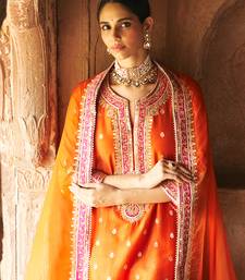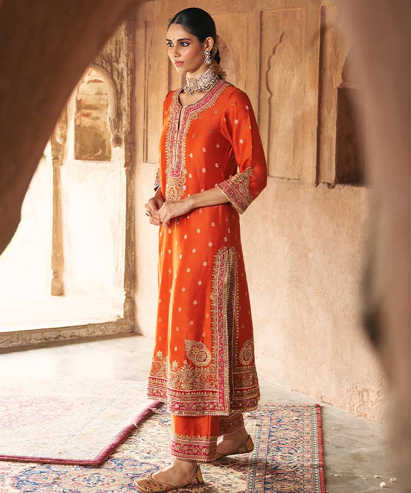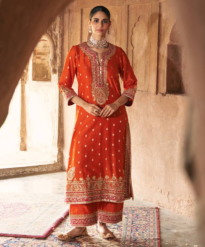 Orange embroidered chanderi silk kurta set