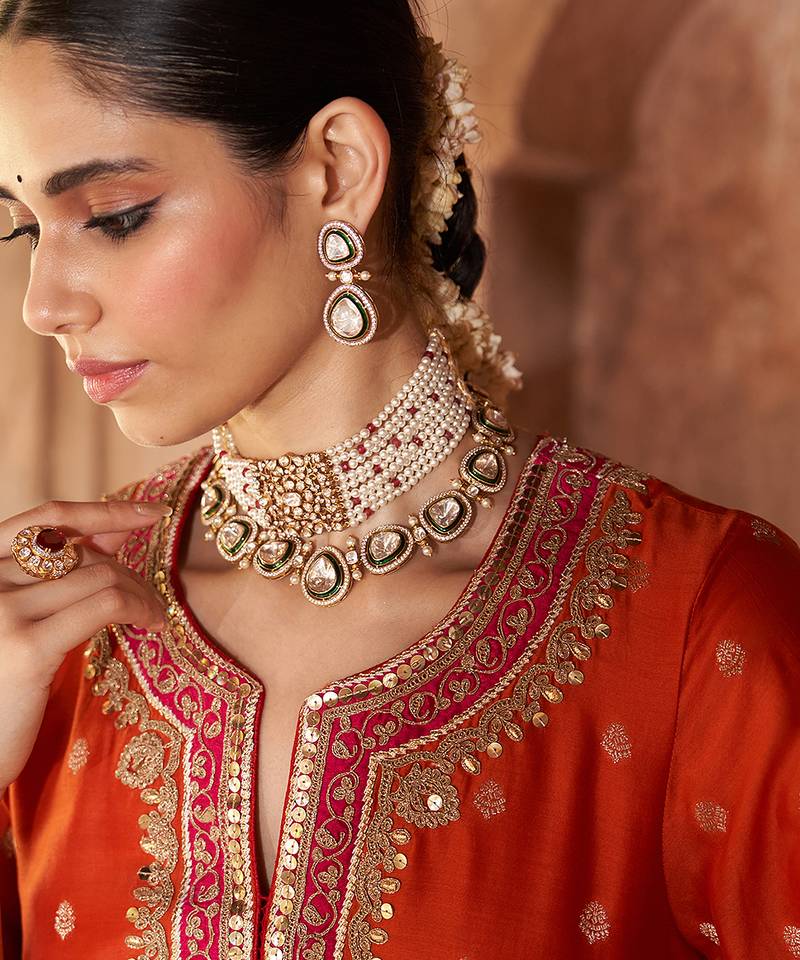 Product Description | A Graceful Long A Line Kurta Paired With Palazzos And A Silk Organza Dupatta. The Kurta Features A Zero Neckline With Placket And Three Quarter Sleeves. Adorned With Intricate Kashmiri Tilla And Gota Patti Embroidery, Highlighted With Pearls And Sequins, The Ensemble Is Beautifully Finished With Delicate Gota Detailing.