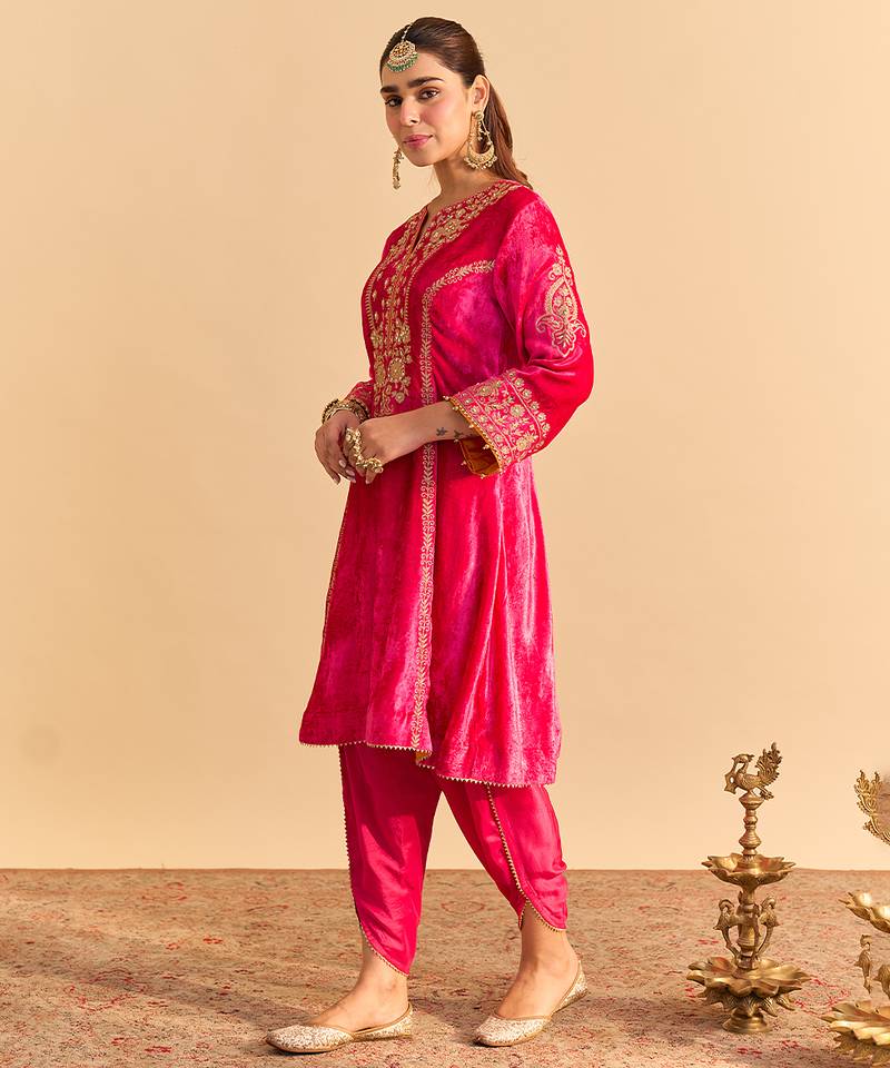 Pink embroidered velvet kurta set