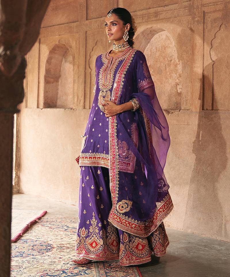 Product Description | An Elegant Ensemble Featuring A Pure Banarasi Short Kurta With A Zero Neckline And Front Slit, Zero Back, And Elbow Sleeves. It Is Paired With A Sharara Showcasing A Broad Border And Embroidered Bootis, Along With A Beautifully Embroidered Silk Organza Dupatta. Adorned With Intricate Kashmiri Tilla And Gota Patti Embroidery, Highlighted With Pearls And Sequins, The Outfit Is Finished With Delicate Gota Detailing For A Regal Finish.
