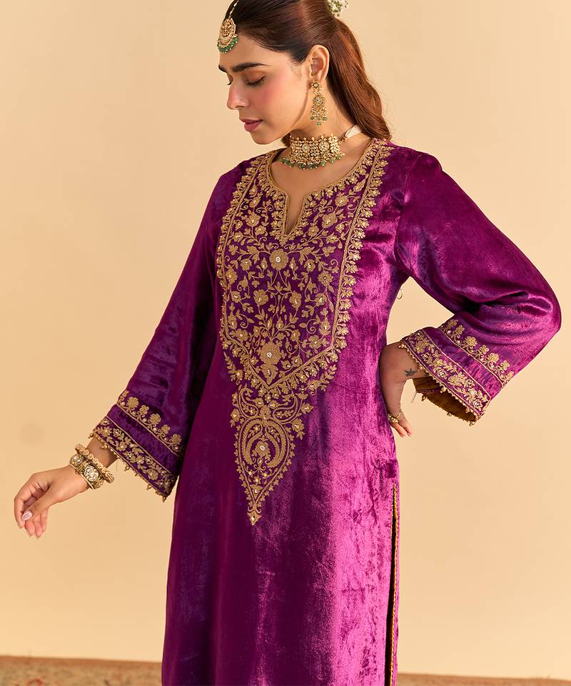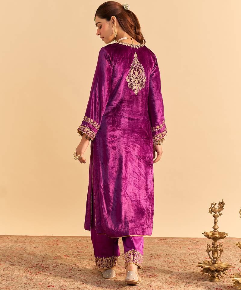 Purple embroidered velvet kurta set