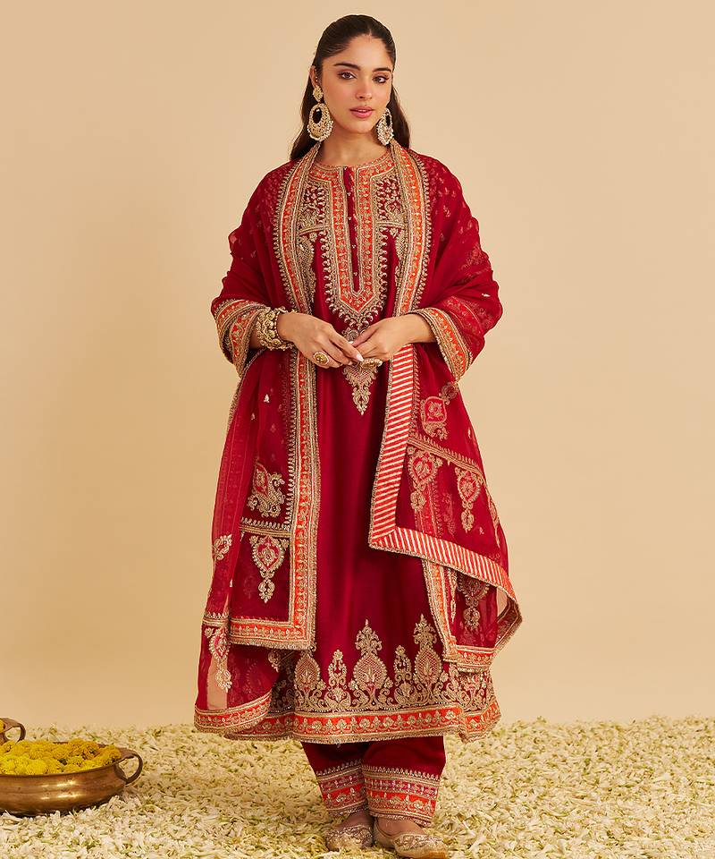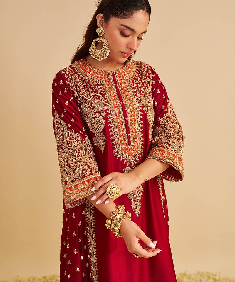 | Product Description | This Red Embroidered Silk Kurta Set With Dupatta Exudes Elegance And Festive Sophistication. Crafted From Luxurious Silk, It Features Intricate Embroidery That Enhances Its Refined Appeal. The Gracefully Tailored Kurta Paired With Coordinated Bottoms And A Matching Dupatta Creates A Regal Silhouette, Perfect For Weddings, Celebrations, Or Special Occasions.