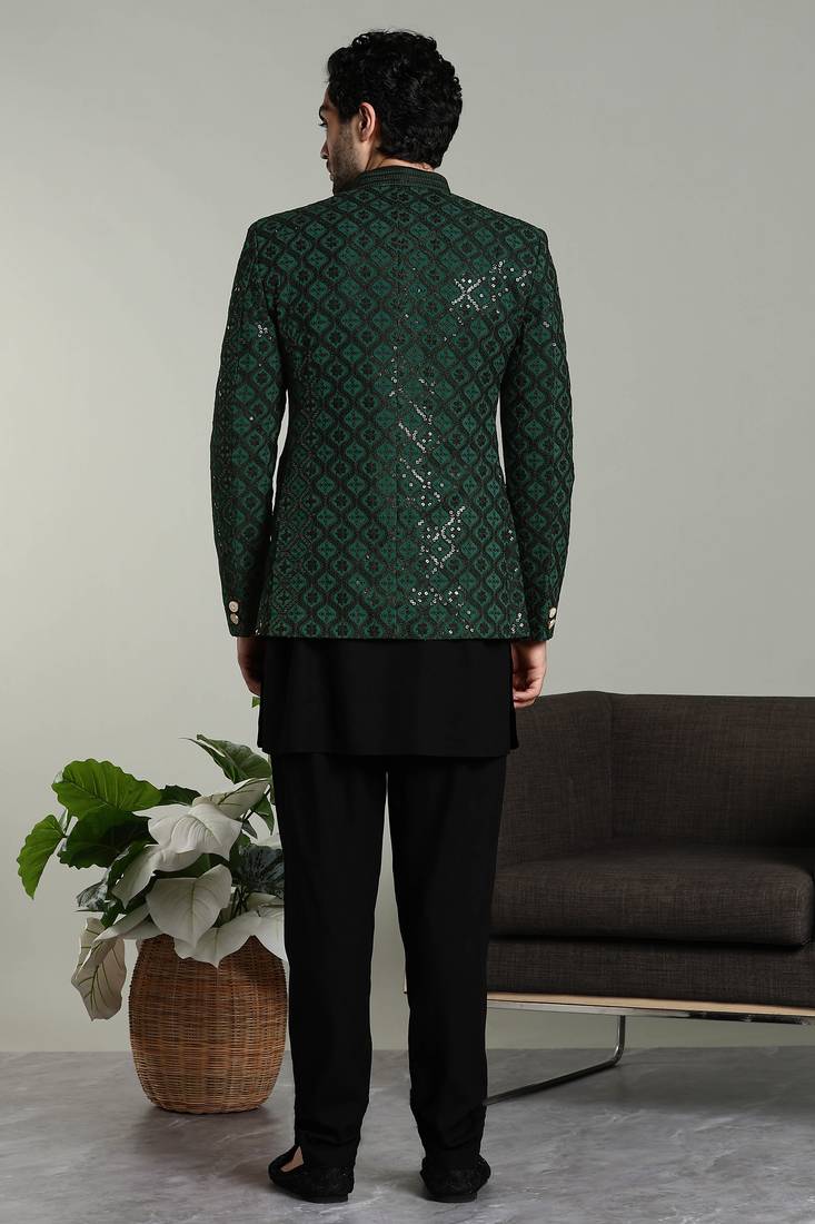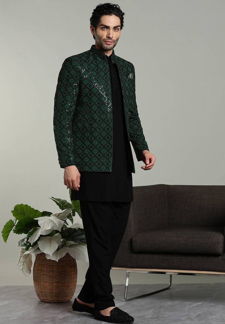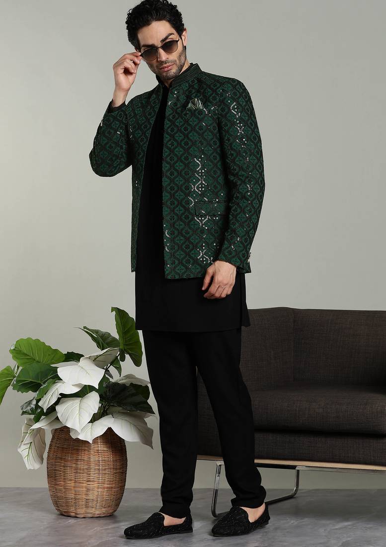 Product Description | A Stylish Festive Ensemble Featuring A Vibrant Bottel Green Sequin Coat Paired With A Sleek Black Short Kurta Set. Crafted In Soft Rayon Fabric For Comfort And Elegance, Perfect For Celebrations And Evening Occasions. |