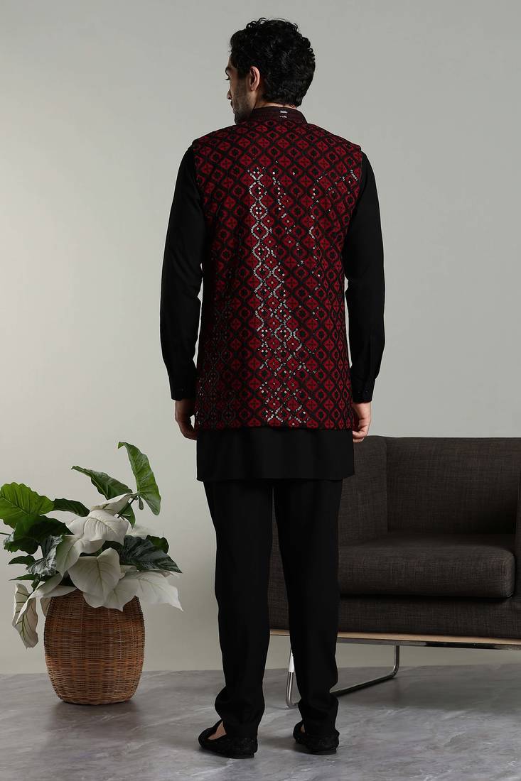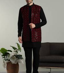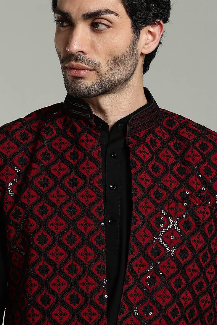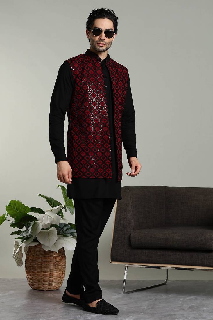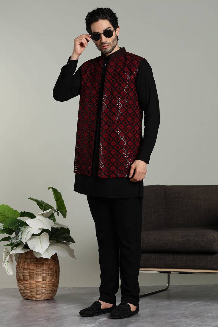Product Description | A Stylish Festive Ensemble Featuring A Vibrant Red Sequin Coat Paired With A Sleek Black Short Kurta Set. Crafted In Soft Rayon Fabric For Comfort And Elegance, Perfect For Celebrations And Evening Occasions. |