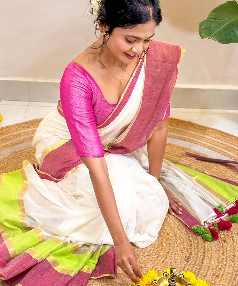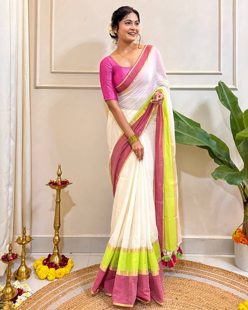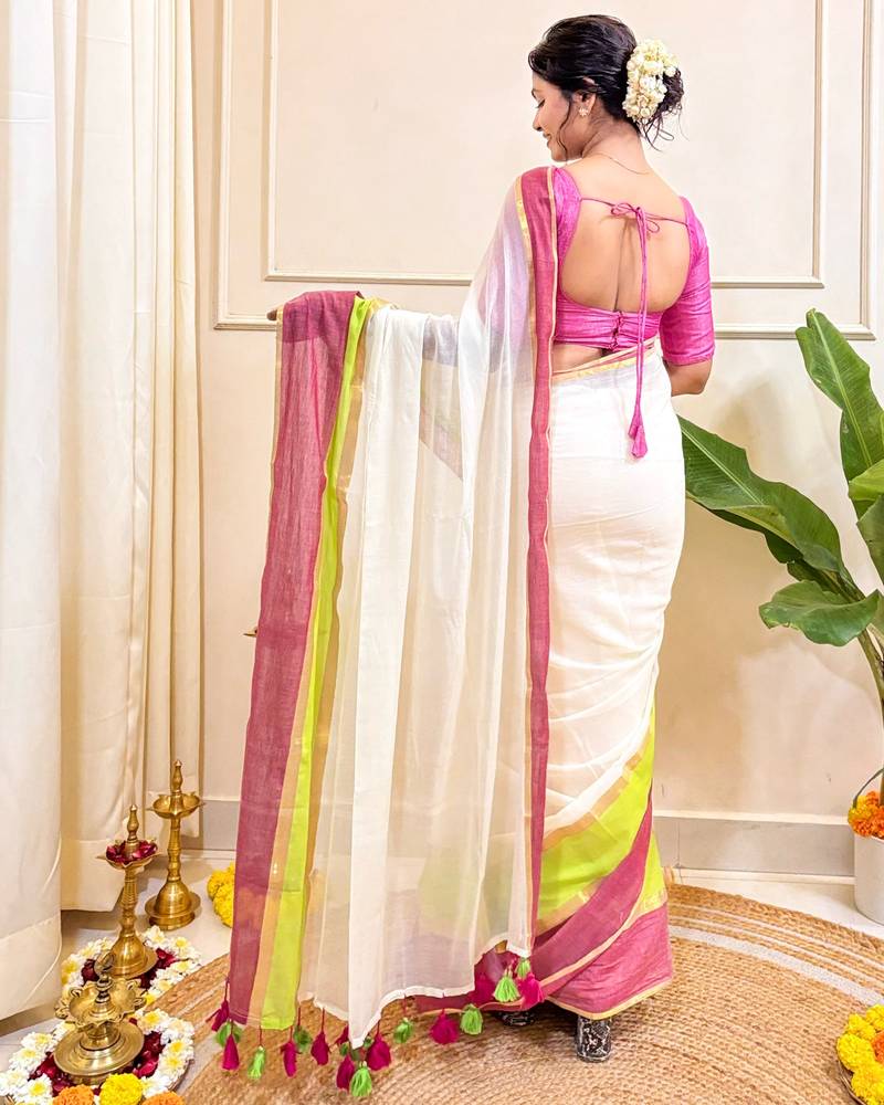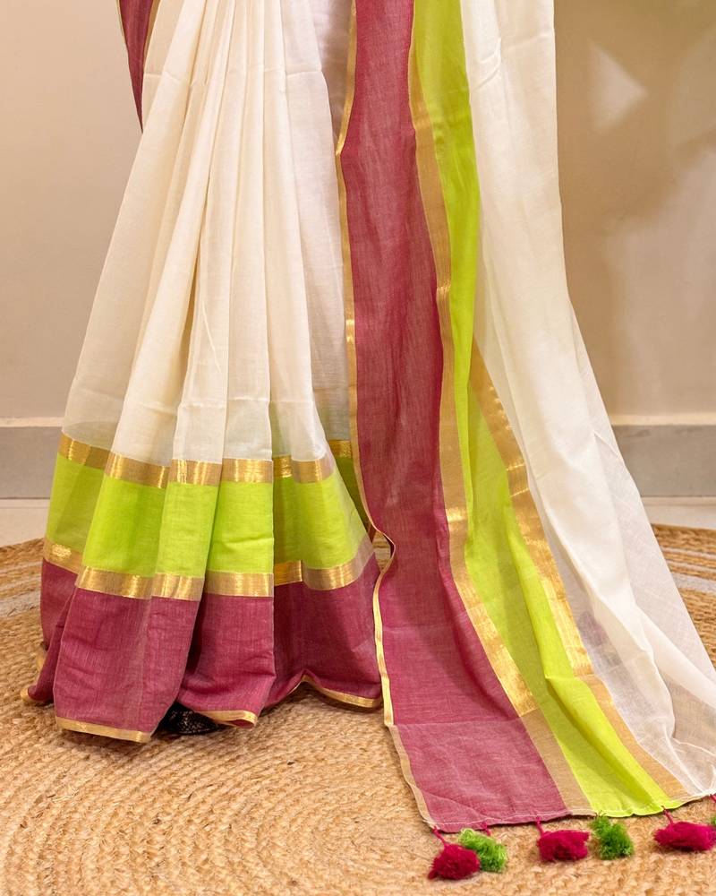 Product Name | White Green Pink Cotton Saree Without Blouse Piece | |