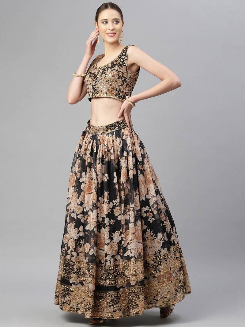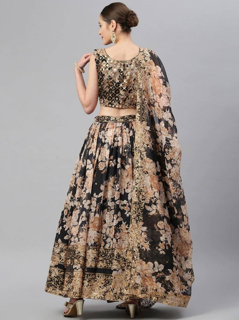 | Product Description | Black Embellished Semi Stitched Lehenga Unstitched Choli With Dupatta Has Beautiful Flower Print On Embroidered,Zari & Sequinned Work. Black Flower Printed Embroidered Unstitched Blouse, Black Semi Stitched Lehenga, Flared Hem, Attached Lining. Black Embellished Organza Dupatta Has Same Border. |