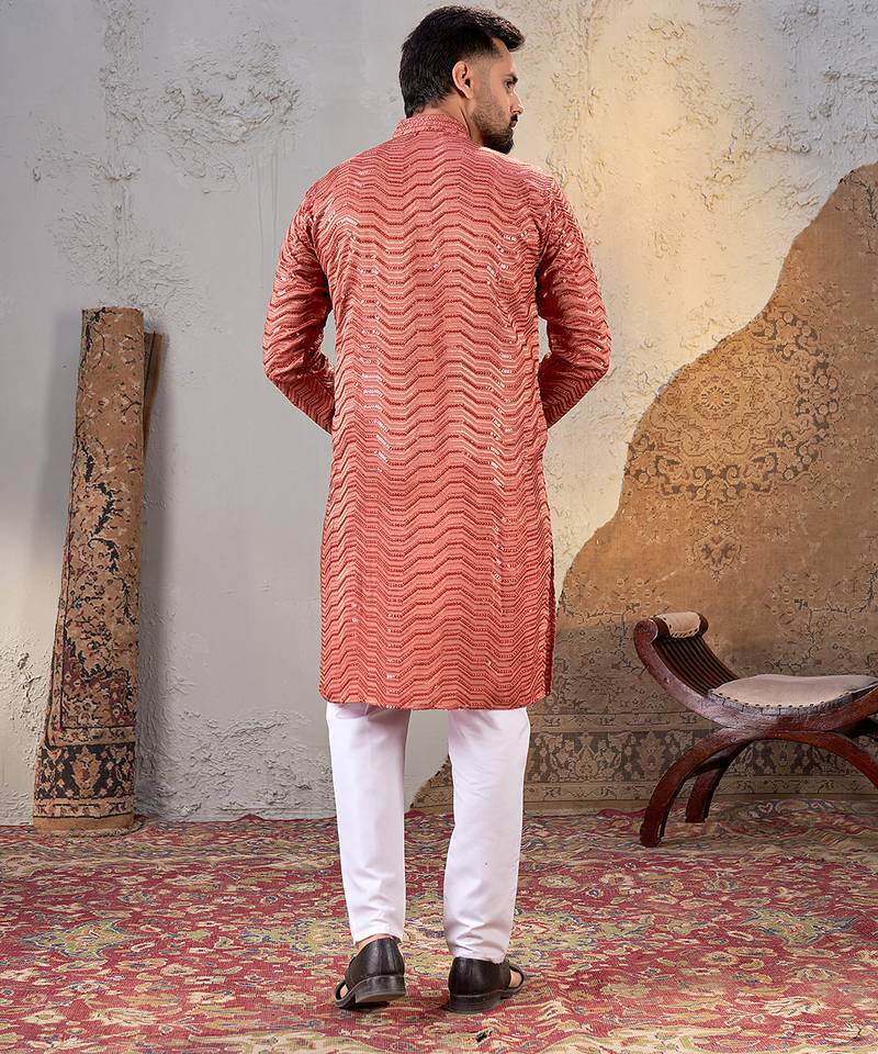 | Product Description | Elevate Your Ethnic Style With This Men’s Dark Peach Rayon Kurta, Designed For Comfort And Festive Elegance. Made From Soft And Breathable Rayon Fabric, It Features An All Over Zigzag Sequin Embroidered Pattern With A Subtle Sheen And A Smart Mandarin Collar. The Straight Fit Silhouette Ensures Ease Of Movement And A Polished Look. Perfect For Weddings, Festivals, Family Functions, And Traditional Occasions. |