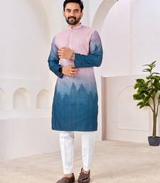 | Product Description | Showcase Contemporary Elegance With This Men's Ombre Printed Kurta. Designed With A Beautiful Gradient That Transitions Smoothly From Soft Pink To Serene Blue, Featuring A Subtle Tree/Forest Pattern At The Bottom. Crafted From A Lightweight, Breathable Cotton Fabric For All Day Comfort. This Regular Fit Kurta Includes A Mandarin Collar And Full Sleeves, Making It A Perfect Standout Choice For Festive Events, Parties, Or Stylish Casual Wear. |