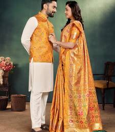| Product Name | Orange Jacquard Silk Kurta Payjama Koti & Saree Couple Set | |