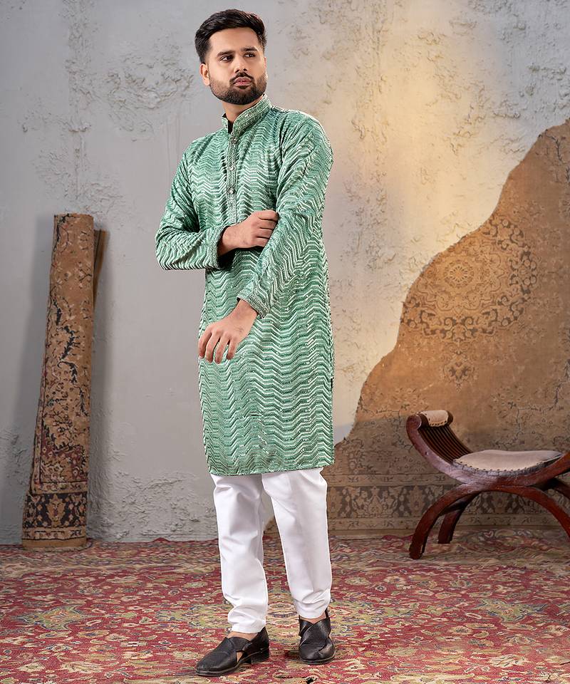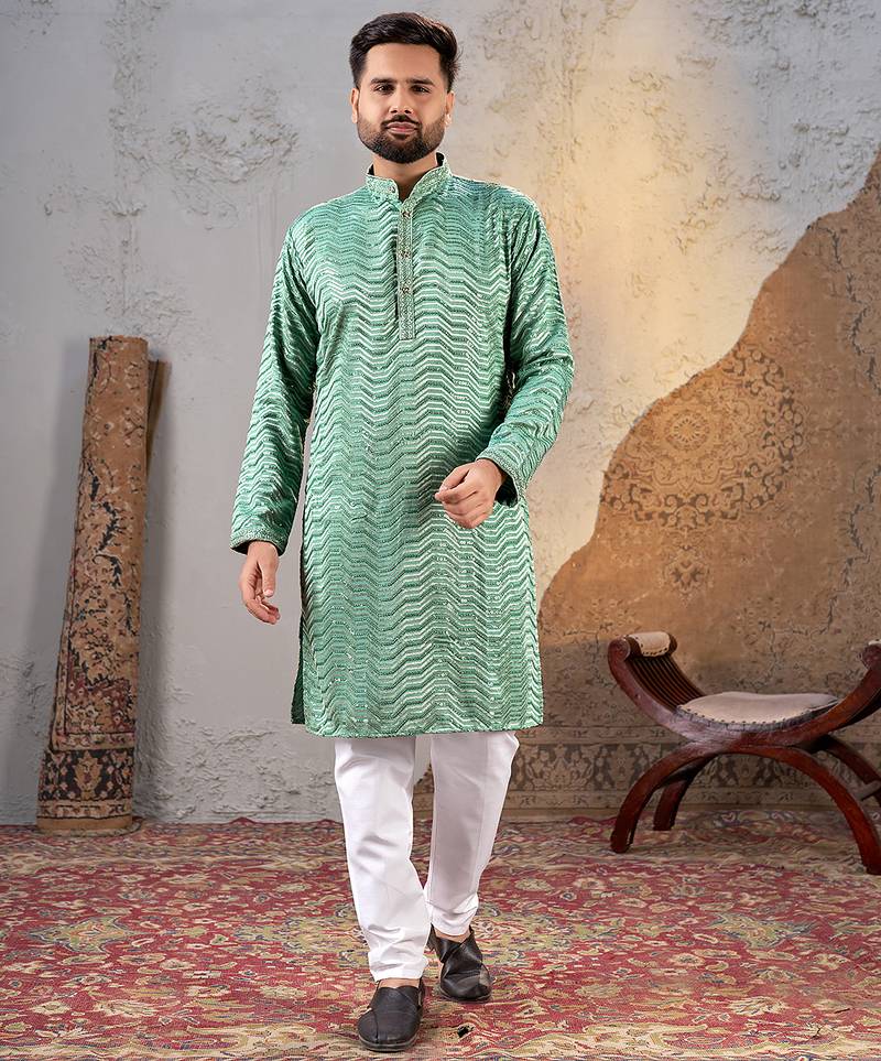| Product Description | Elevate Your Ethnic Style With This Men’s Sea Green Rayon Kurta, Designed For Comfort And Festive Elegance. Made From Soft And Breathable Rayon Fabric, It Features An All Over Zigzag Sequin Embroidered Pattern With A Subtle Sheen And A Smart Mandarin Collar. The Straight Fit Silhouette Ensures Ease Of Movement And A Polished Look. Perfect For Weddings, Festivals, Family Functions, And Traditional Occasions. |