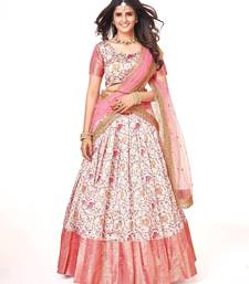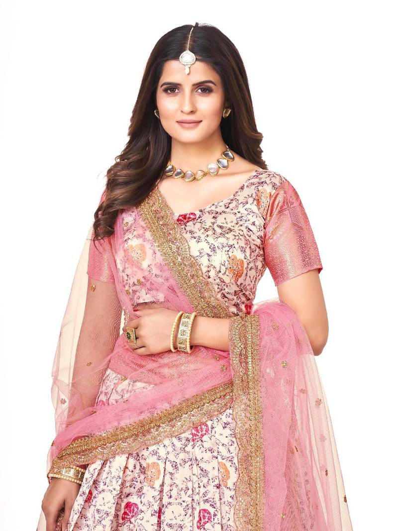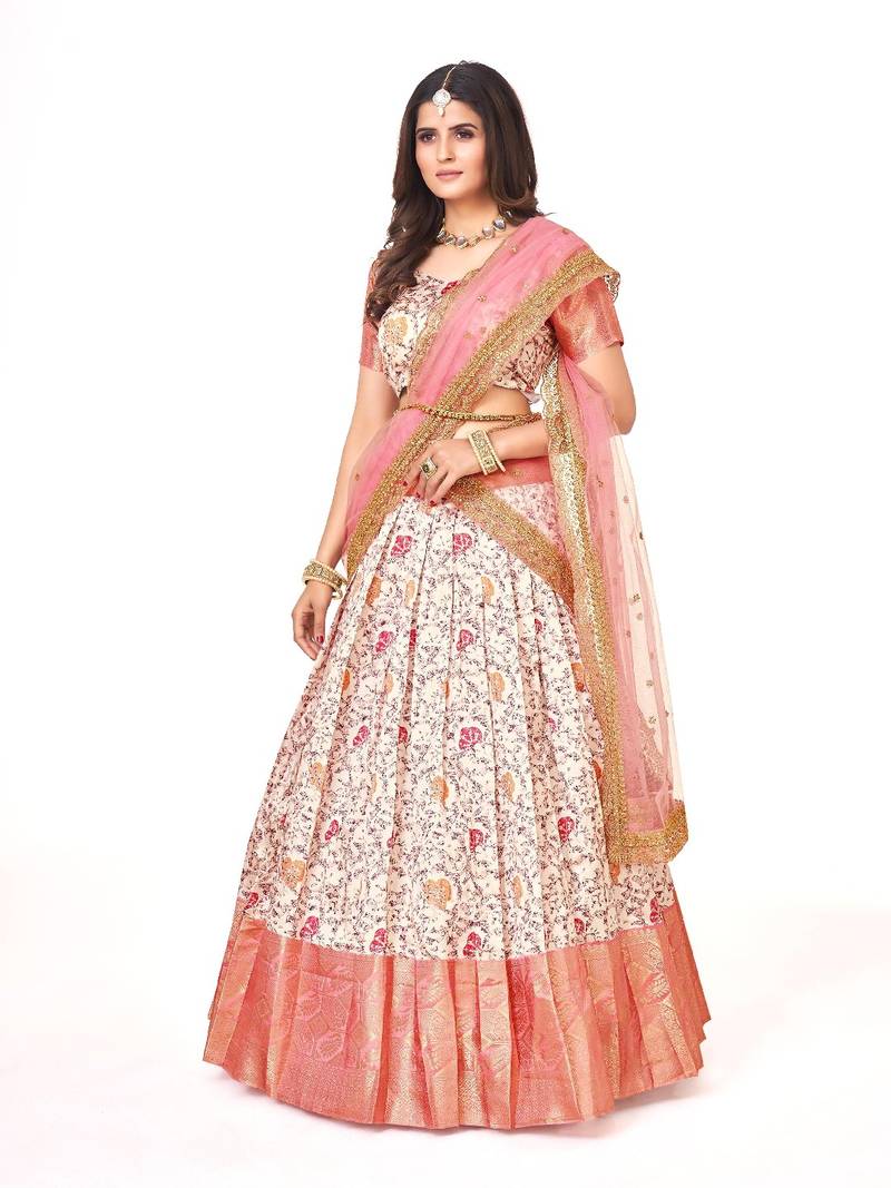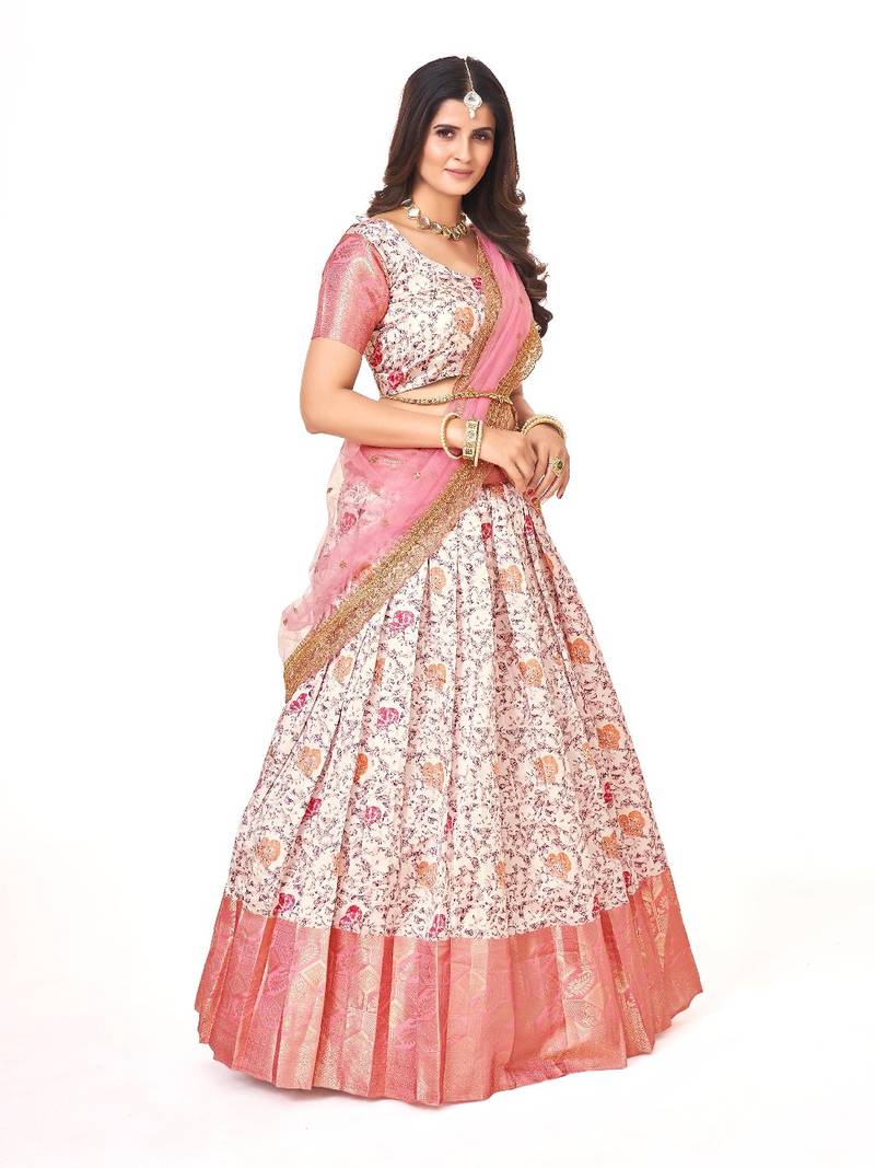 Baby Pink And Gold Toned Woven Design Dupatta, With Border. The Artistic Features Of The White Half Saree Itself Are Very Adoring. Half Saree Has Three Parts Namely The Blouse, The Skirt, And The Dupatta. The Evolved Version Of The Half Saree Is Now Fashionably Called Lehenga. Half Saree Has A Sense Of Renowned Traditional Touch To It. This Piece Of Beauty Has Been Worn By Women In Earlier Days.