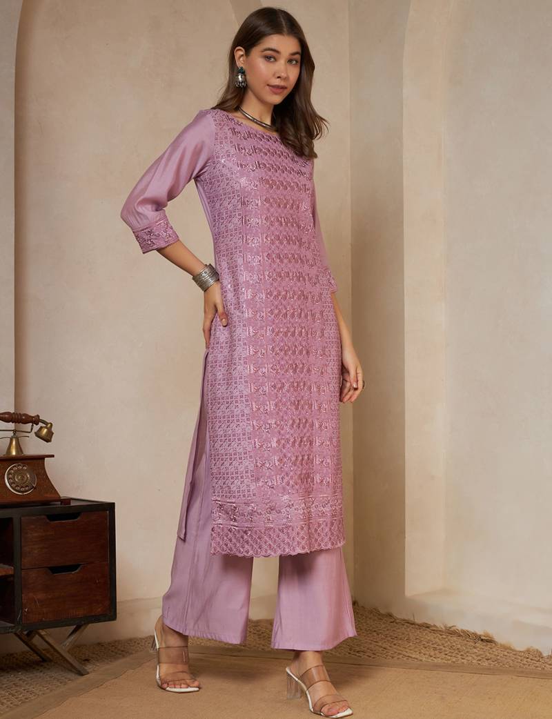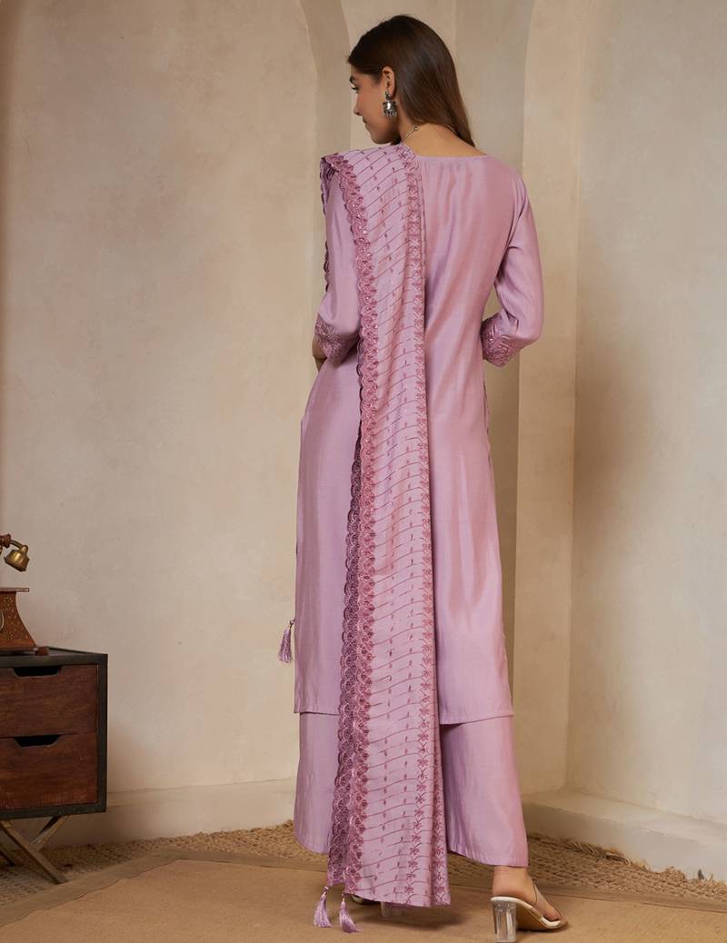 | Product Description | This Pink Embroidered Silk Kurta Palazzo And Dupatta Set Features A Delicately Sequined Kurta Adorned With Ethnic Motifs, Paired With Matching Silk Palazzo Pants For A Coordinated Look. Crafted From Soft, Premium Silk, The Kurta Includes A Round Neckline And Quarter Sleeves For Elegant Styling, While The Silk Dupatta Complements The Ensemble With A Luxurious Drape. The Embroidered Pattern Adds Refined Texture And Subtle Festive Appeal. Lightweight And Comfortable, This Stitched Set Balances Traditional Charm With Modern Fashion, Making It Suitable For Weddings, Cultural Celebrations, Or Upscale Casual Gatherings, Offering A Graceful Silhouette And Polished Ethnic Style. |