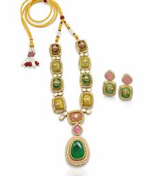 The Rang Mahal Kundan Statement Necklace Set Is Designed For Moments That Demand Attention. Featuring A Series Of Intricately Crafted Multicolor Motifs, This Piece Is Elevated With A Bold Green Drop Pendant That Adds Richness And Depth.