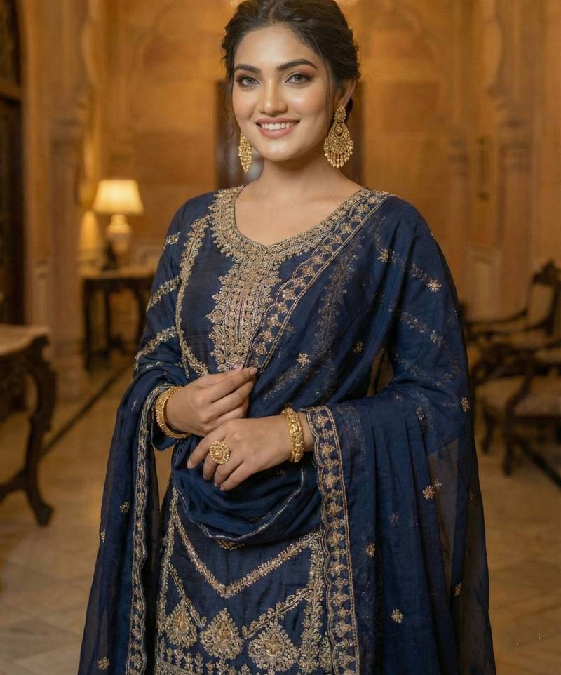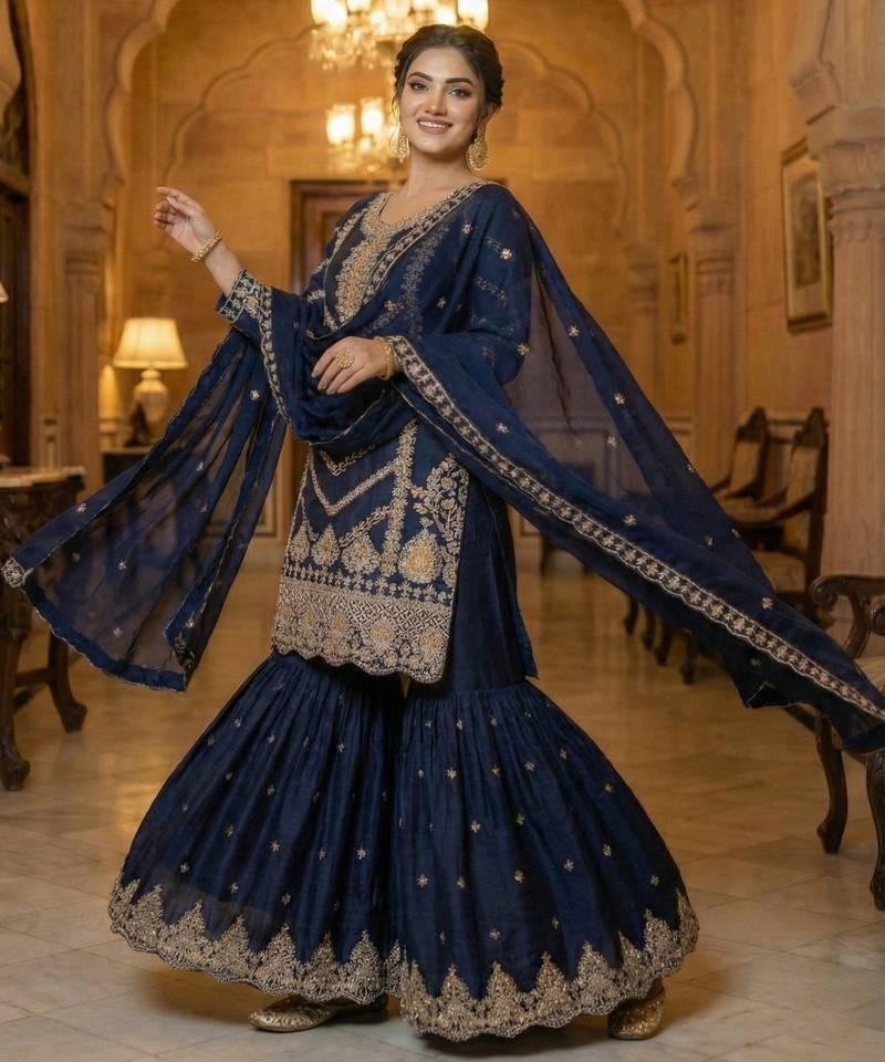 | Product Name | Designer Fancy Chinon Fabric Readymade Blue Sharara Salwar Suit Collection | |