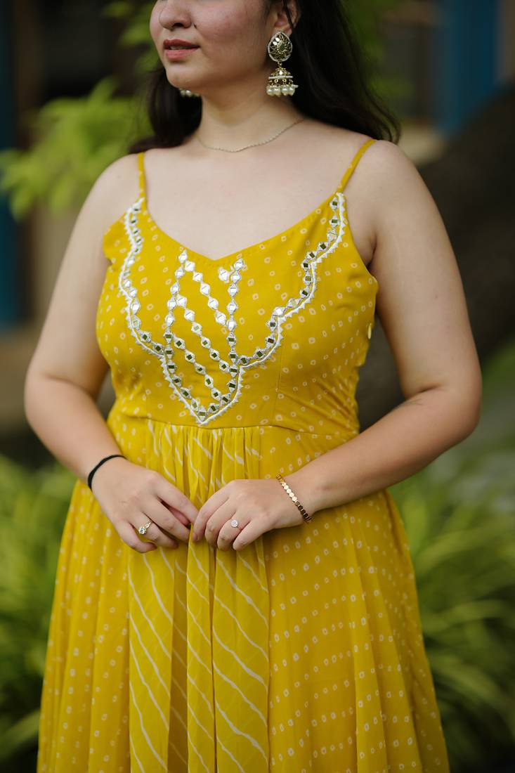 Product Description | Glow With Elegance In This Chic Long Leheriya Dress, A Perfect Blend Of Tradition And Modern Charm. The Refreshing Green Hue, Adorned With Delicate Leheriya Stripes And Bandhej Patterns, Exudes Festive Cheer, While The Mirror Work Detailing On The Neckline Adds A Touch Of Sparkle. Its Flowy Silhouette And Strappy Style Make It An Effortlessly Graceful Choice For Celebrations, Brunches, Or A Mood When You Just Want To Dress Up Chic. |