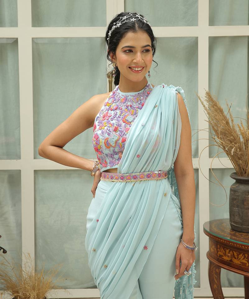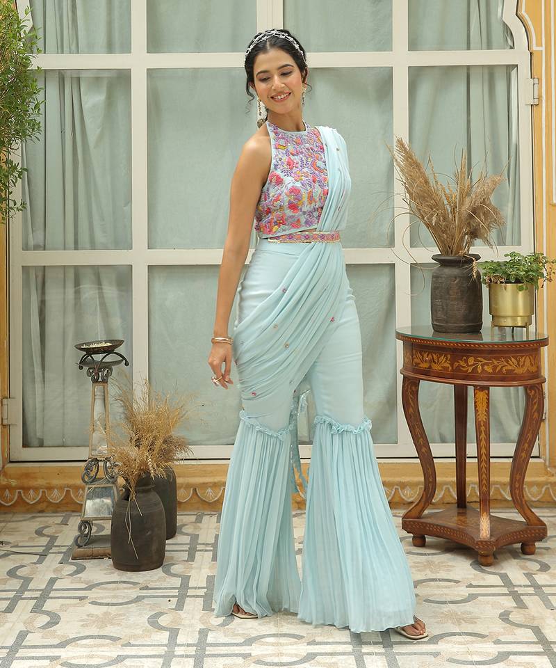 | Product Description | Baby Blue Candy Embroidered Halter Neck Blouse With Attached Statement Frill Dupatta Sharara Set. |