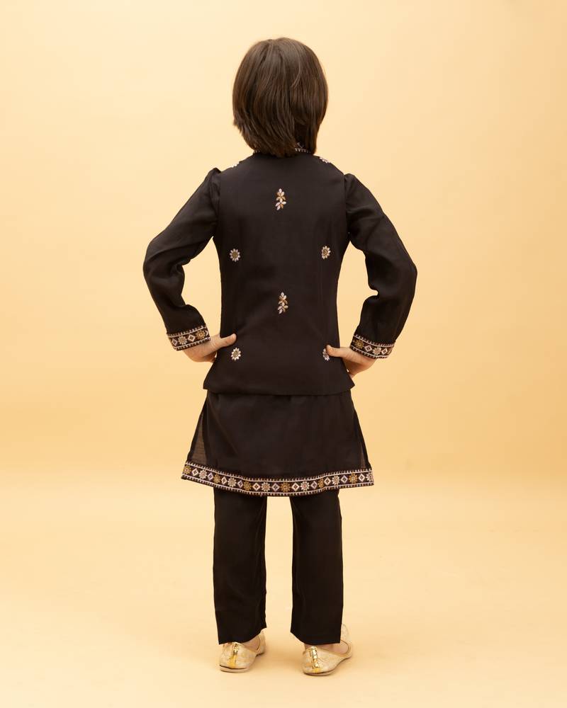 Black viscose silk nehru jacket set with sequins embroidered work