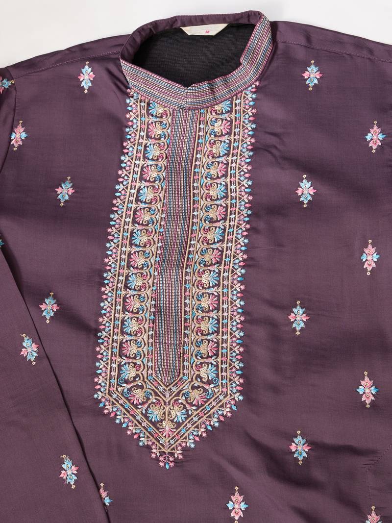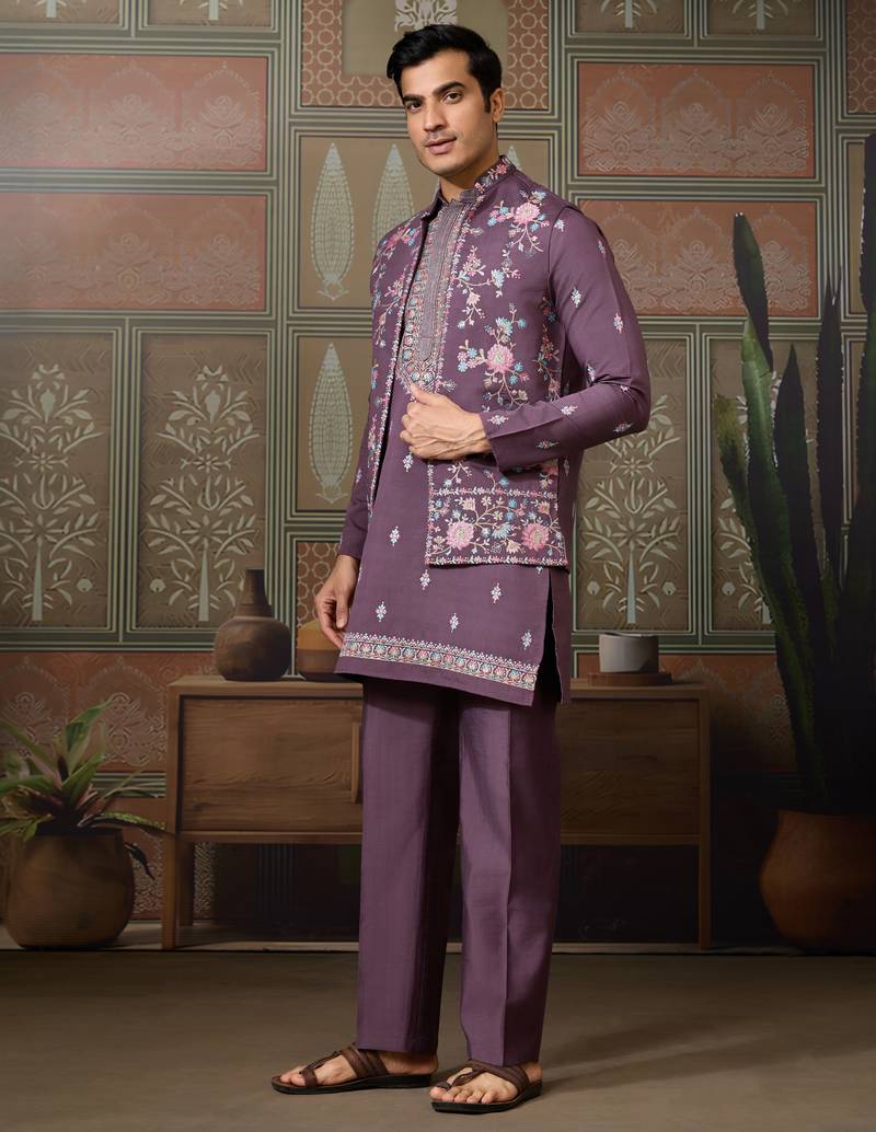 | Product Name | Dusty Purple Silk Premium Thread & Sequins Embroidered Work Festival Party Wear Straight Kurta With Jacke And Pant | |