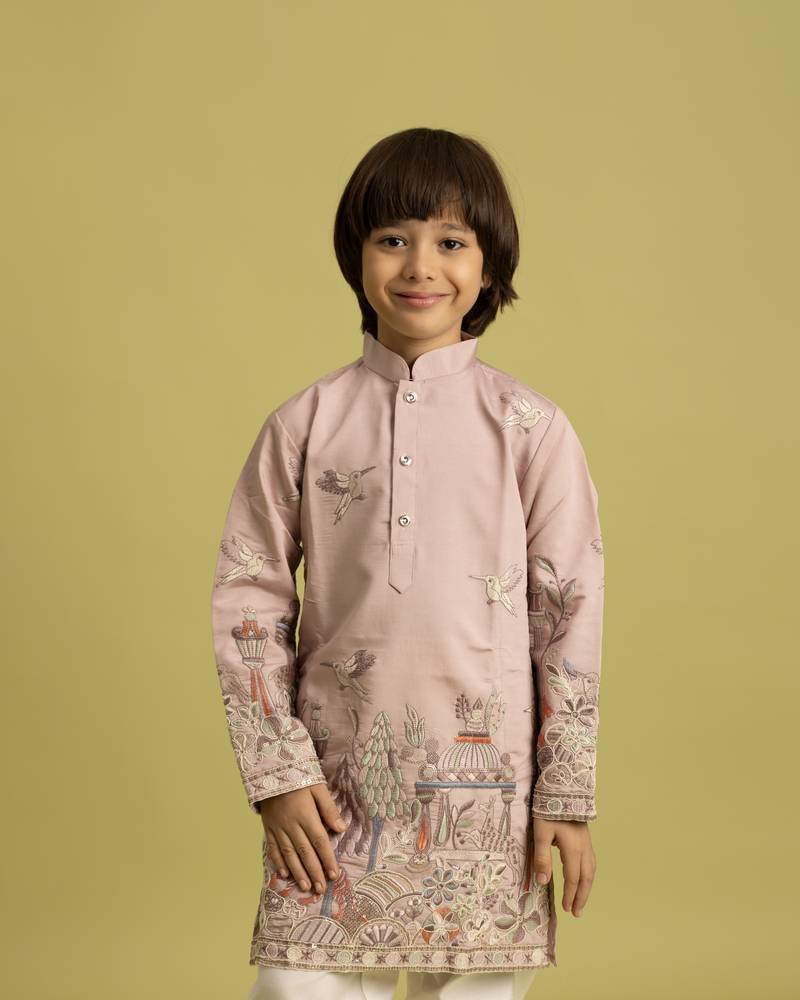 Peach viscose silk thead with sequins embroidered work wedding function festival party boys straight kurta pant