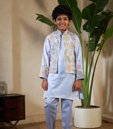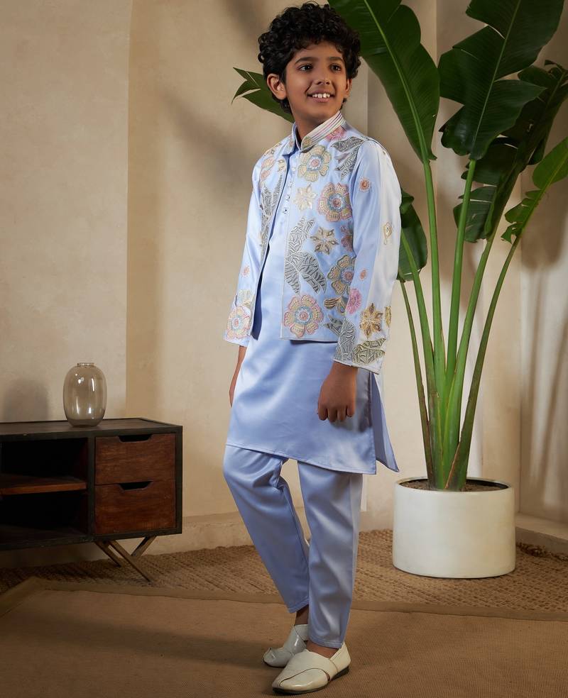 | Product Name | Sky Blue Satin Thead With Sequins Embroidered Work Wedding Function Festival Party Boys Straight Kurta Pant Koti | |