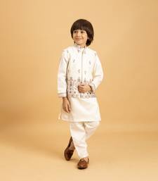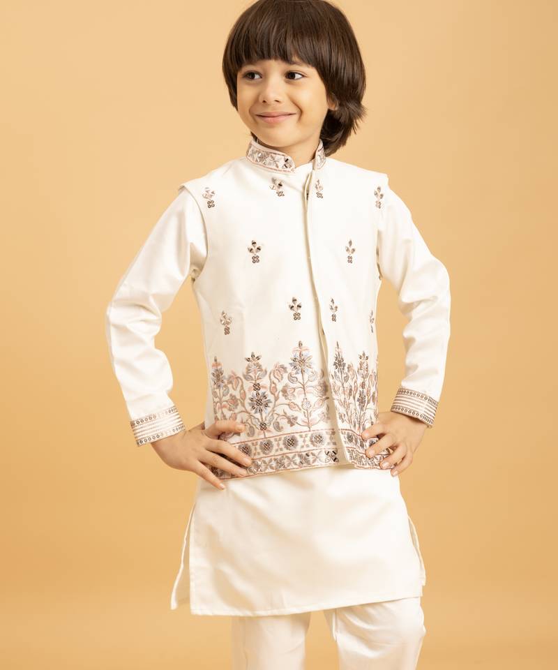 | Product Name | White Satin Thead With Sequins Embroidered Work Wedding Function Festival Party Boys Straight Kurta Pant Koti | |