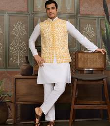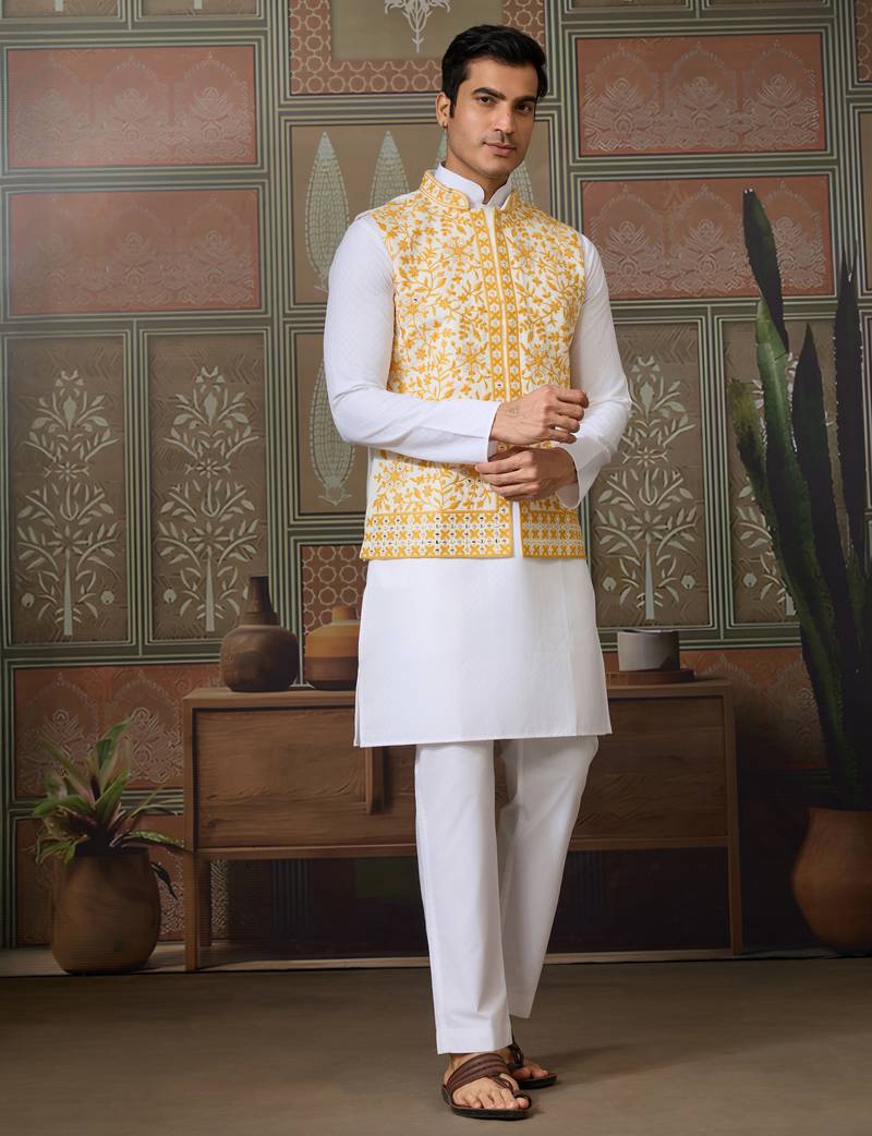 | Product Name | White Yellow Silk Real Mirror With Thread Embroidered Work Festival Party Wear Straight Kurta With Jacke And Pant | |