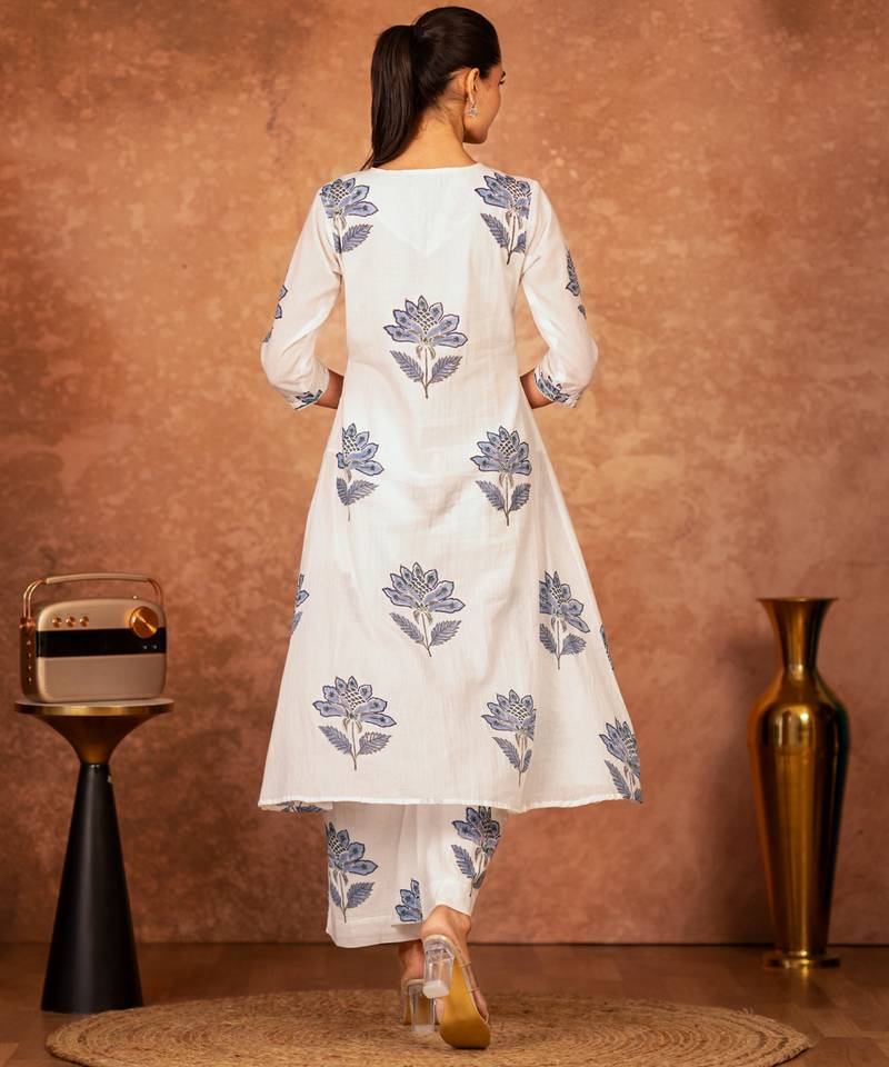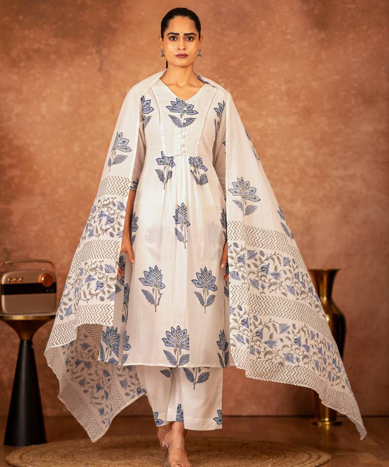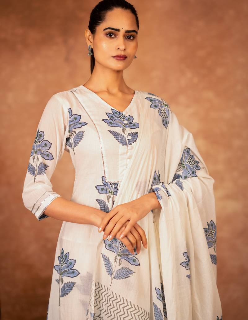 | Product Name | Off White Blue Hand Block Printed Cotton Suit Set Of 3 | |
