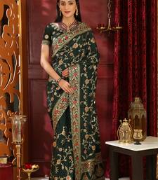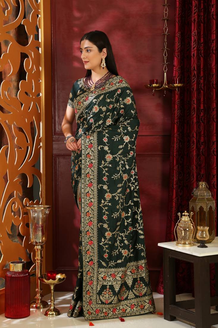 Dark green embroidered silk saree with blouse