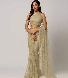 Beige embroidered net pre draped saree set