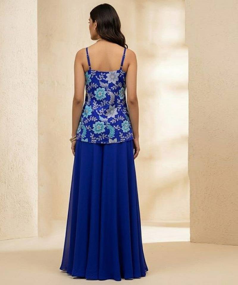 | Product Description | This Blue Crepe Sharara Set Features Artistic Prints For A Refined Festive Look. The Lightweight Fabric Drapes Effortlessly While The Silhouette Adds Elegance. Ideal For Cultural Events And Stylish Family Gatherings.