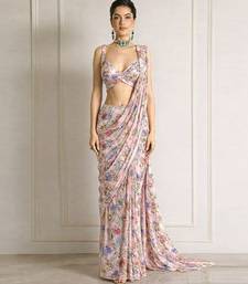 Pink printed crepe pre draped saree set