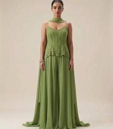 | Product Description | This Sage Green Crepe Sharara Set Features Intricate Embroidery That Adds A Graceful Touch. The Soft Fabric Ensures Comfort While The Flared Sharara Creates Elegant Movement. Perfect For Festive Occasions, It Pairs Beautifully With Traditional Accessories For A Refined And Stylish Ensemble.
