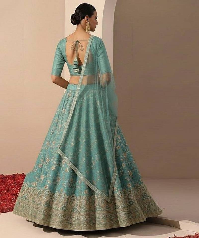 | Product Description | This Turquoise Blue Tissue Lehenga Set Features Elegant Embroidery That Enhances Its Luminous Texture. The Fabric’s Soft Sheen Adds Sophistication While The Flared Silhouette Creates A Graceful Look. Paired With A Coordinated Blouse And Dupatta, It Is Ideal For Festive Occasions And Special Celebrations.