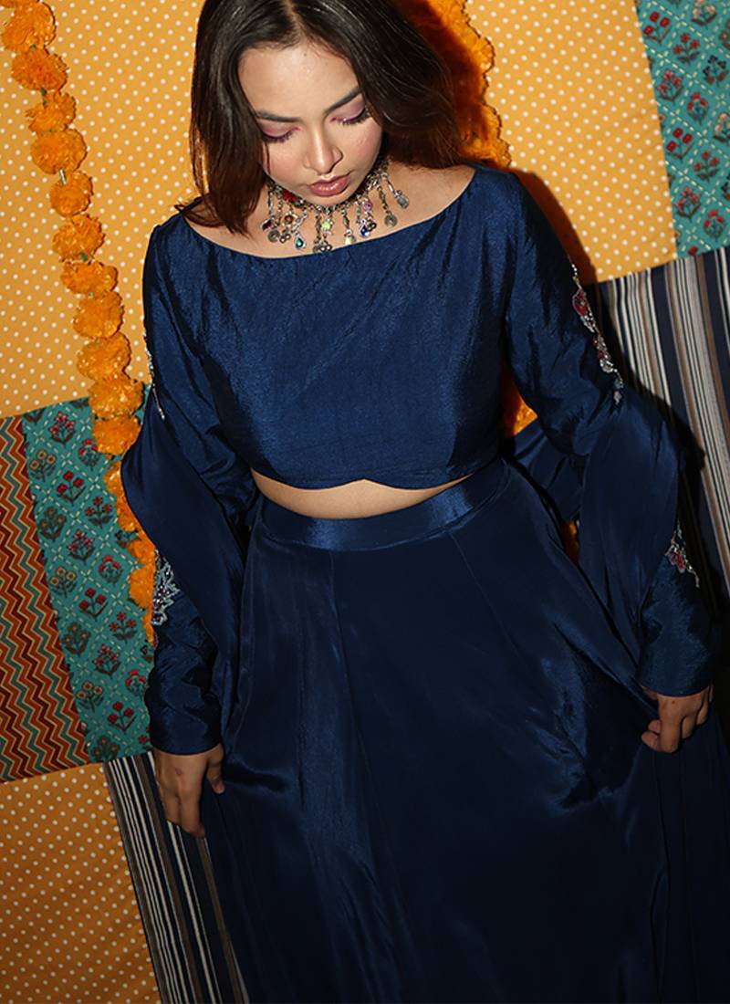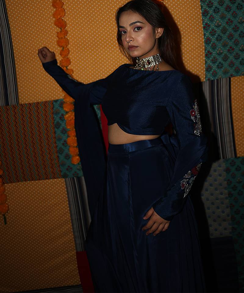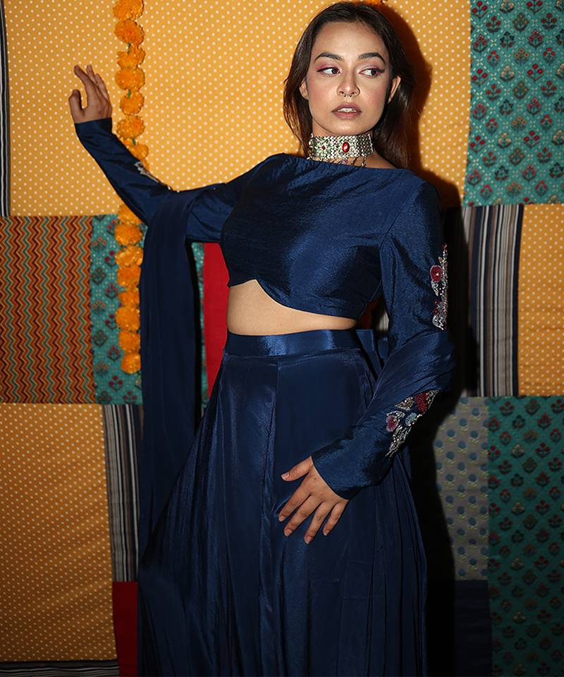 Blue embroidered crepe lehenga set