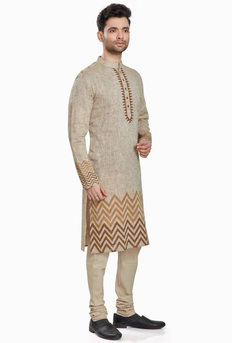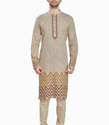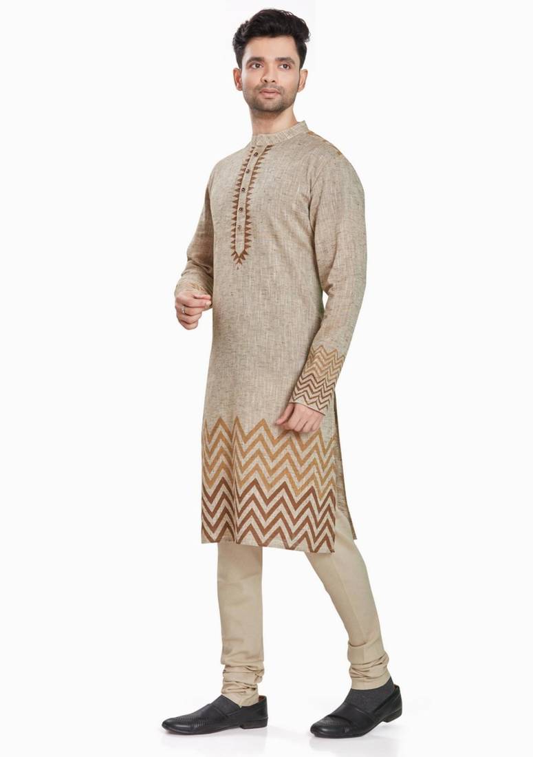 Beige hand block printed kurta with embreoidery viscos kurta payjama etnic wear :: festive wear