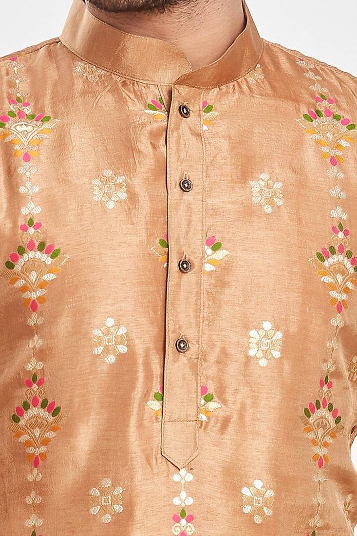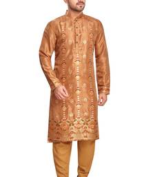 Brown hand block printed kurta with embroidery banarsi silk kurta payjama etnic wear :: festive wear